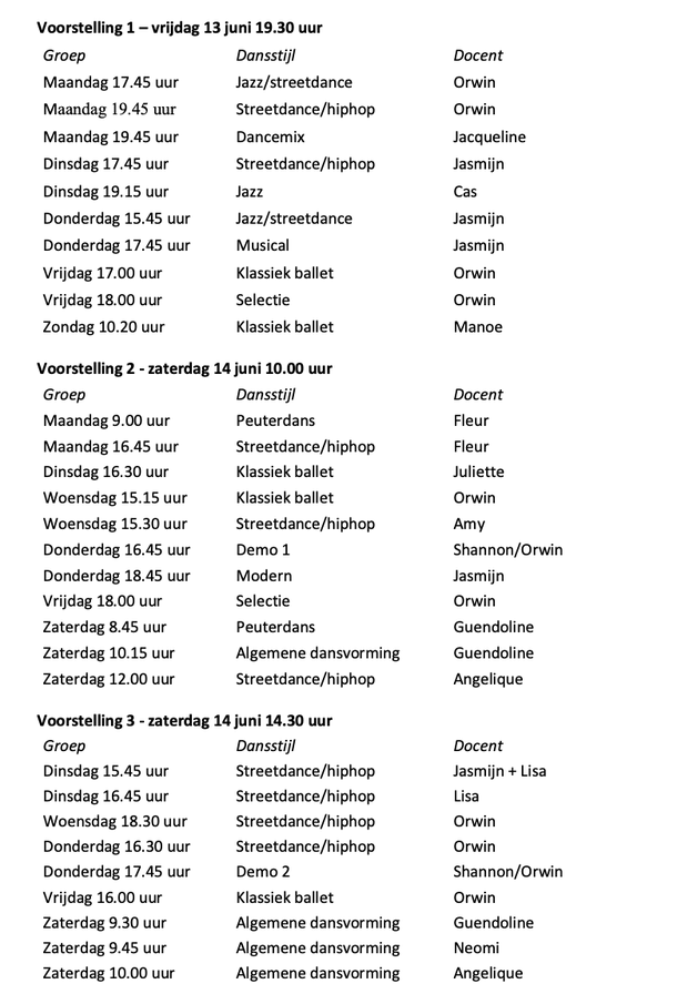 Alle groepen worden verdeeld over 6 voorstellingen. Iedere groep danst in één voorstelling met twee choreografieën en de finaledans. Enkele