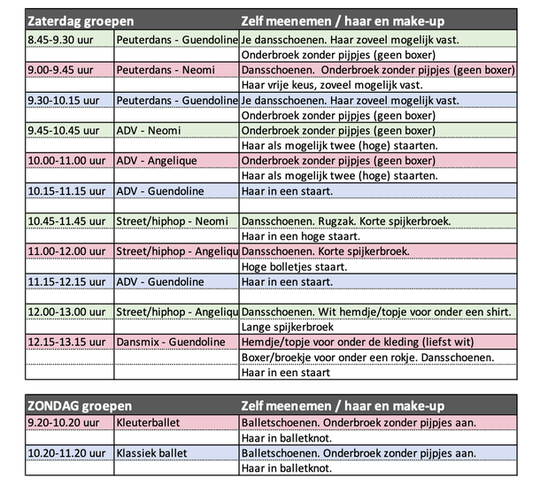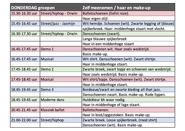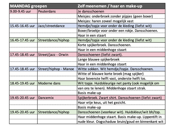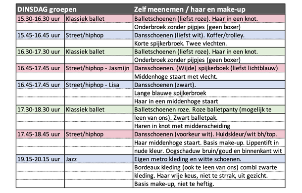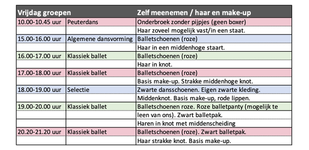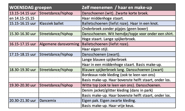 Bij sommige groepen staat basis make-up. Dit houdt in: foundation/poeder, blush, mascara, roze of rode lippenstift, eventueel wenkbrauwen aanzetten bij lichte wenkbrauwen. Wij hebben ook make-up en haarspullen in de kleedruimtes staan, dus mocht je iets niet hebben dan kun je dit ook bij ons doen.